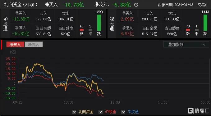 昨天净卖出超 101 亿元的北向资金今天继续卖出,截至发稿,北向资金净卖出 10.78 亿元。