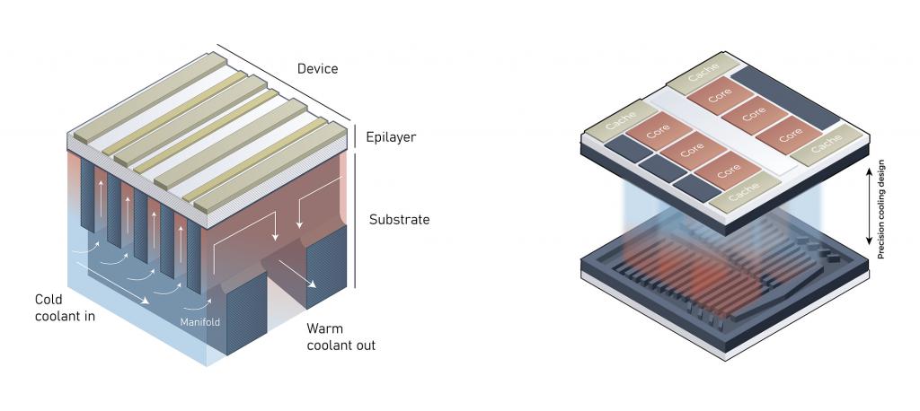 Corintis 技术的核心在于一体式 3D 微观通道网络的设计与制造。在 Corintis,芯片和微流体冷却通道网络从一开始就是一同设计的。Corintis 在硅基板上涂覆的氮化镓层上蚀刻出长 30 微米、深 115 微米的狭缝,利用特殊的气体刻蚀技术扩大狭缝,形成泵送液体冷却剂的输送通道,再用铜密封住氮化镓层上的微小开口,并继续在上面制造器件。微通道被蚀刻在基板内,并与芯片上最容易升温的部分精确对齐。这让液体冷却剂能够与硅芯片直接接触,将散热速率提高 10 倍,冷却性能提高 50 倍。