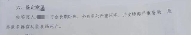 鉴定意见书显示,尸检结果载明,右侧后肋可见陈旧性骨折,鉴定意见为符合长期卧床,全身多处严重压疮、并发肺部严重感染,最终致多器官功能衰竭死亡。