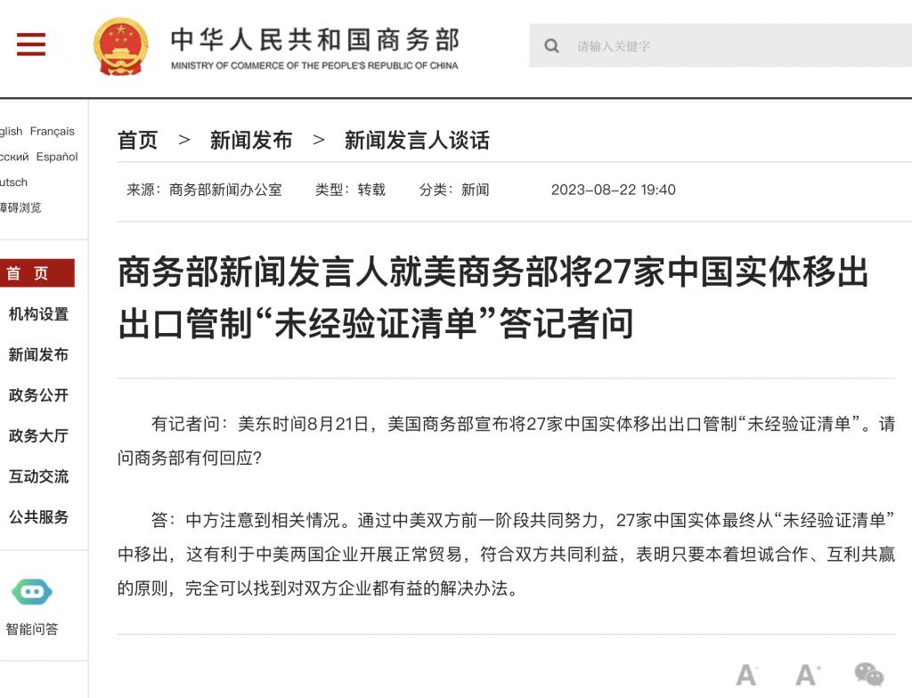 据商务部网站 8 月 22 日消息,22 日,商务部新闻发言人就美商务部将 27 家中国实体移出出口管制 " 未经验证清单 " 答记者问。
