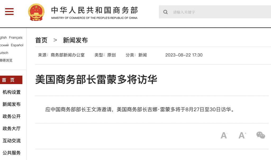据商务部网站 8 月 22 日消息,应中国商务部部长王文涛邀请,美国商务部长吉娜 · 雷蒙多将于 8 月 27 日至 30 日访华。