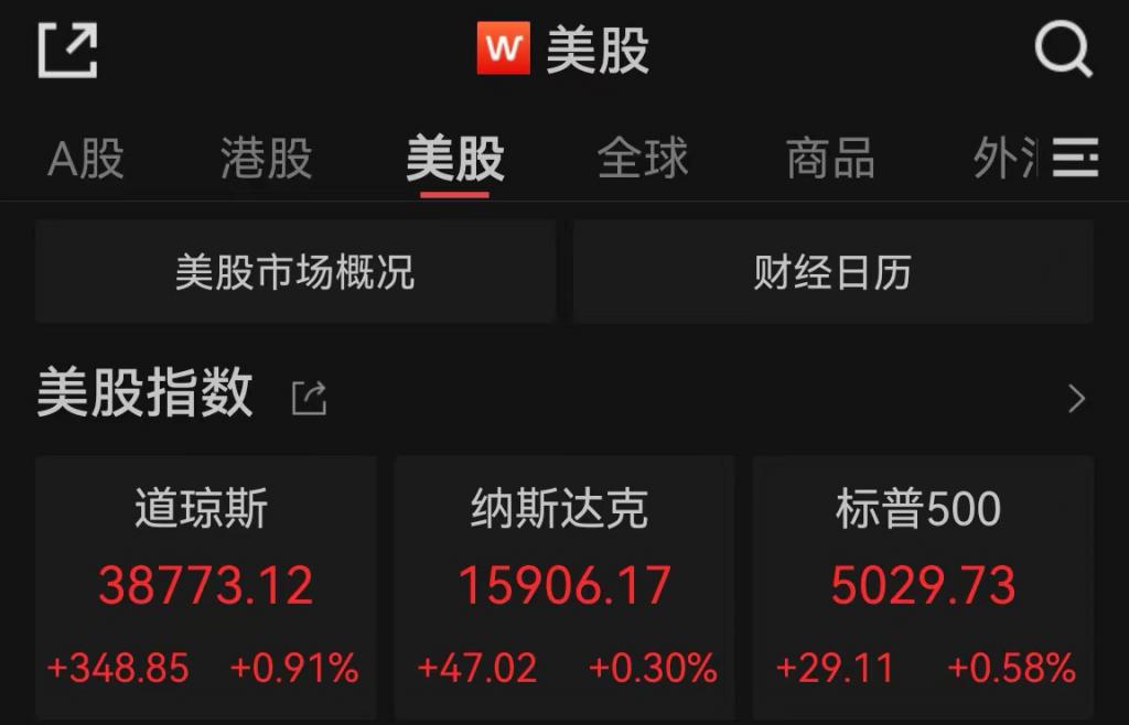 截至收盘,道指涨 0.91% 报 38773.12 点,纳指涨 0.30% 报 15906.17 点,标普 500 指数涨 0.58% 报 5029.73 点。标普 500 指数收盘再创历史新高。