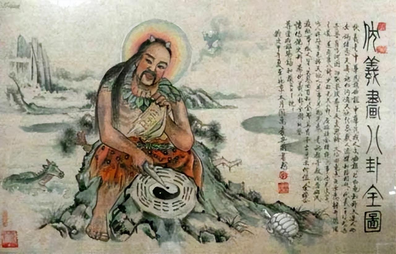 伏羲画卦:伏羲氏在蜘蛛网的启示下发明了八卦,这被认为是人类历史上最早的文字符号系统之一,也是中国文化的源头之一。