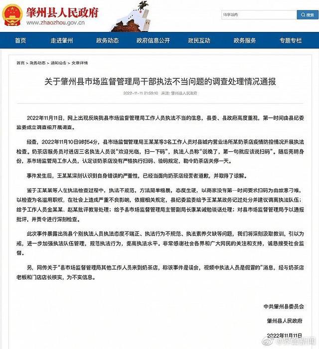 肇州县人民政府网站发布关于肇州县市场监督管理局干部执法不当问题的调查处理情况通报: