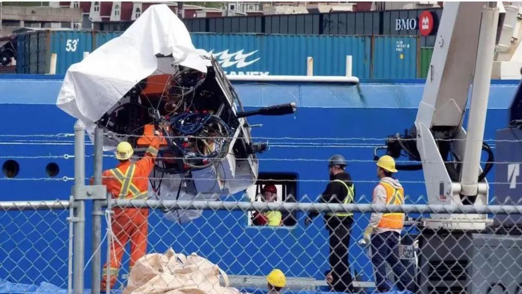 同时,据负责此次搜救工作的公司拍摄的照片显示,在确认发生 " 灾难性内爆 " 一周后," 泰坦 " 号潜水器的巨大部件被打捞出水面,并已运抵加拿大码头。