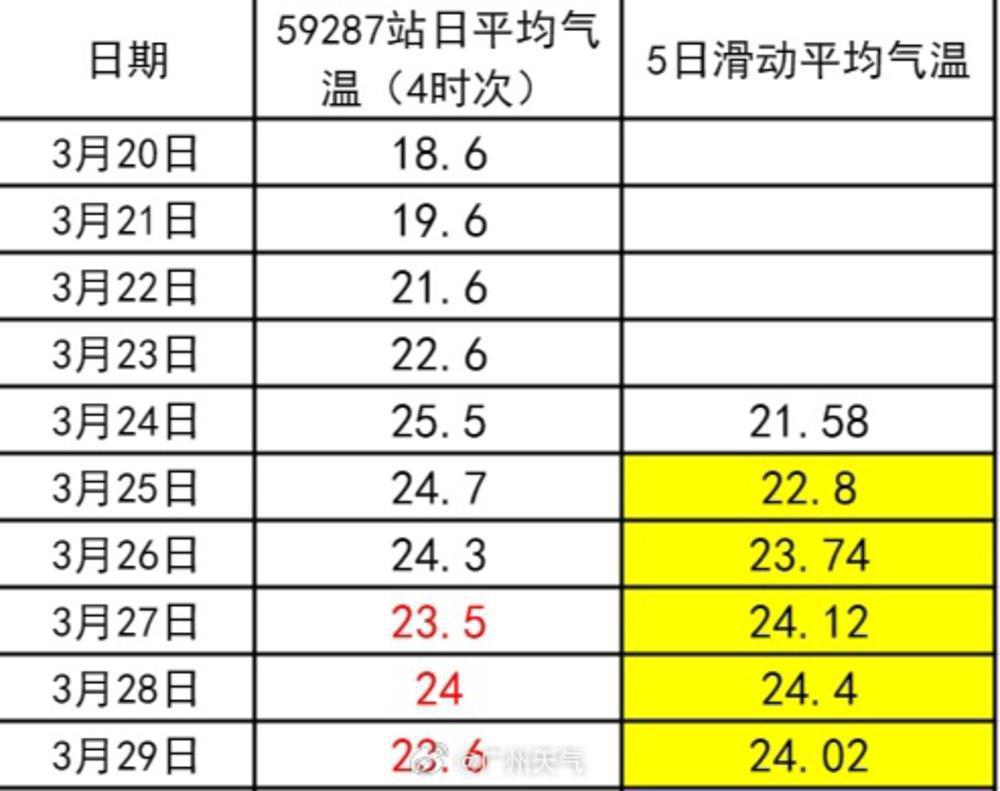 根据广州市气象部门监测,广州国家基本气象站在 2024 年 3 月 23 日录得日平均气温 22.6 ℃,此后的 3 月 24 日至 29 日该站日平均气温均在 22 ℃以上。