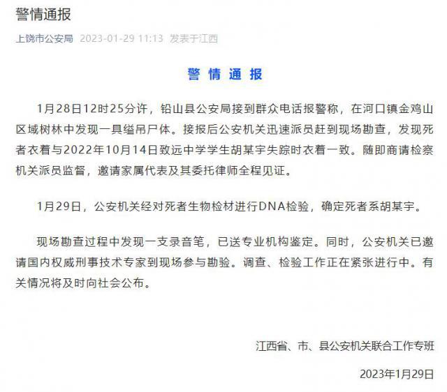 现代快报讯 (记者 孙玉春)在经过一系列的寻找、焦虑、纠结、质疑和迷茫之后,江西上饶高中生胡鑫宇失踪案终于有了结果。1 月 29 上午, 江西省、市、县公安机关联合工作专班发布警情通报,称 1 月 28 日中午在河口镇金鸡山区域树林中发现一具缢吊尸体,经 DNA 检验,确定死者系胡鑫宇。