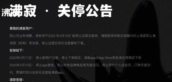 3 月 17 日,字节跳动旗下虚拟时尚社区 " 沸寂 " 发布关停公告,称由于公司业务需要,沸寂将于 2025 年 4 月 19 日起停止运营及服务,用户应在该日前尽快保存上身图和上身视频(如有)等信息。即日起,停止新用户注册、停止下单购买、沸寂 App 在 App Store 和安卓应用商店下架。4 月 10 日起,停止 App 登录,停止所有品牌商品等页面访问,停止用户个人信息页、订单页面访问,届时和以后将无法登录沸寂 App。