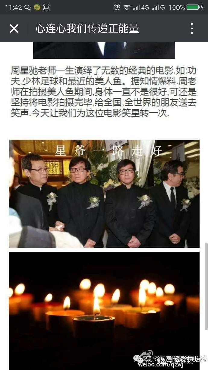 近日,多个微信公众号发布信息称周星驰于2016年5月9日上午在香港因病去世,并附上多张图片,包括成龙、洪金宝、刘德华等明星扶灵送葬的照片。