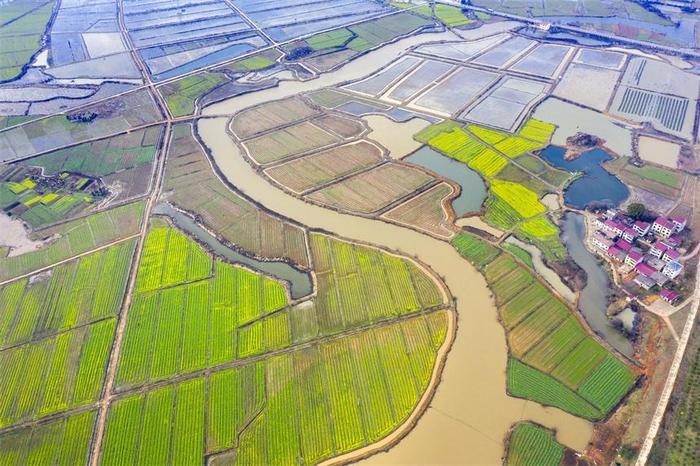 人民网樟树2月17日电 近日,航拍江西省樟树市黄土岗镇管王村,水田星罗密布,菜花竞相绽放,宛如一幅美丽的水乡画卷,美不胜收。