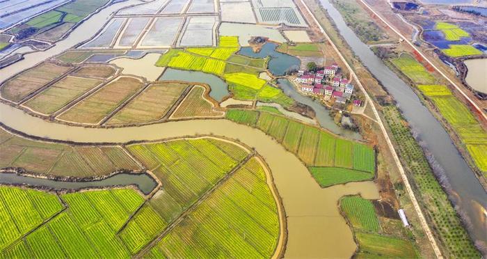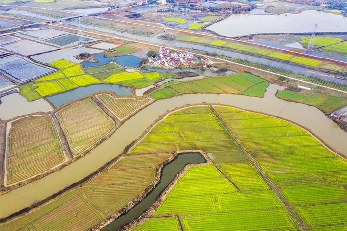 航拍镜头下,水田星罗密布,菜花竞相绽放。周亮摄