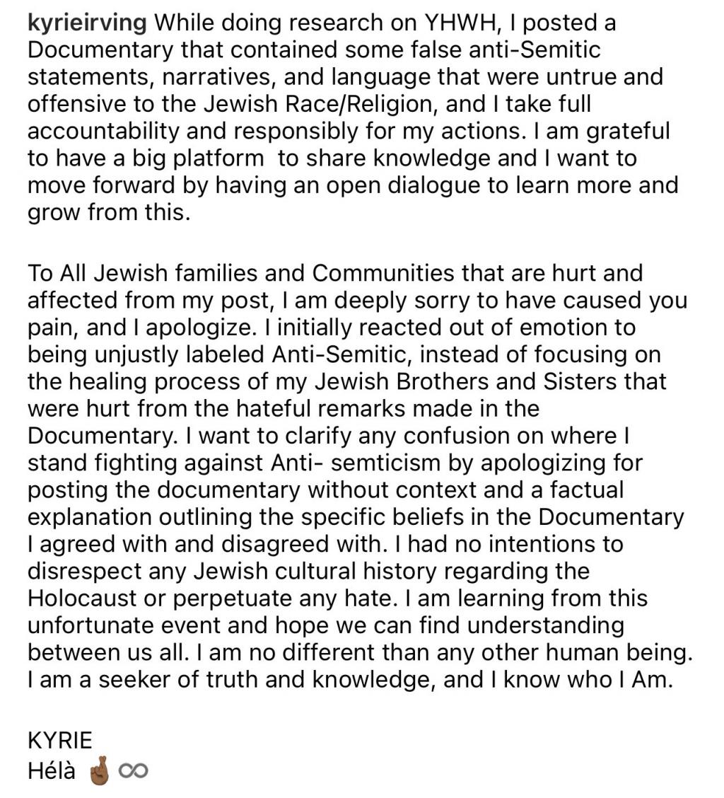 北京时间 11 月 4 日,在近日发表争议言论后,欧文在个人社交媒体上正式道歉。