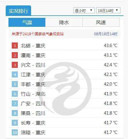 下午两点,全国气温排行榜前十名的 " 门槛 " 已经提升至41 ℃,其中重庆北碚依然以43.6 ℃的气温继续占据全国气温排行榜这一时段的榜首位置。