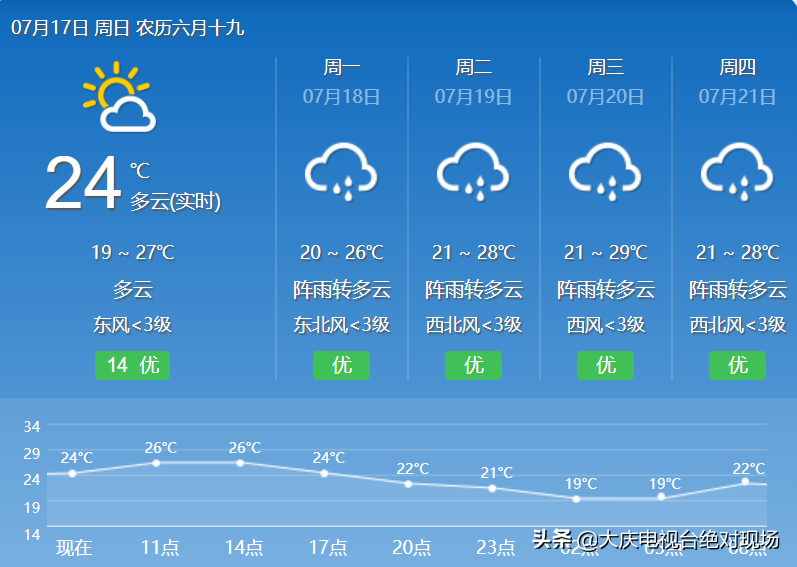 17日白天到17日夜间:晴间多云,局地阵雨,东北风2-3级,27— 19℃。