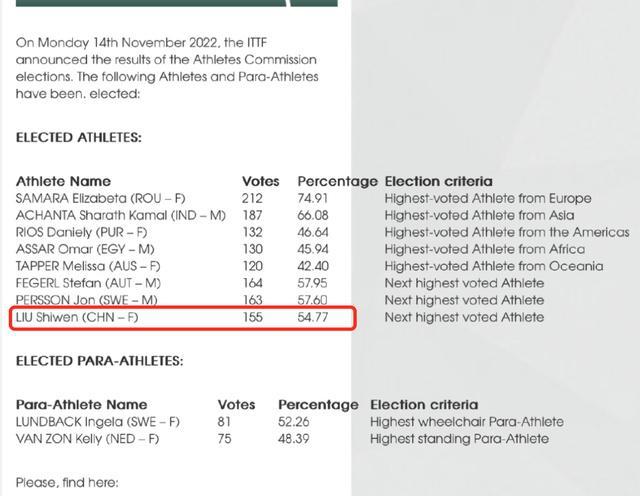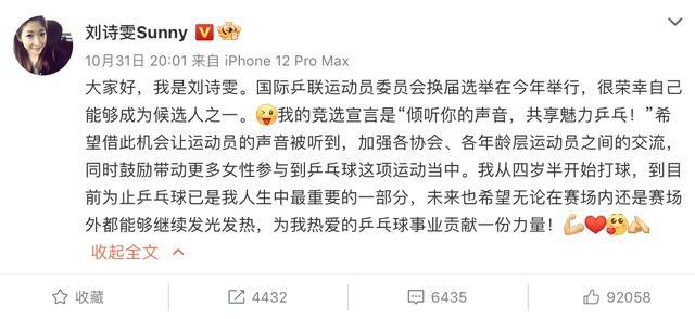 早在 10 月 31 日,刘诗雯就发文称自己成为国际乒联运动员委员会委员候选,竞选宣言是 " 倾听你的声音,共享魅力乒乓!" 希望借此机会让运动员的声音被听到,加强各协会、各年龄层运动员之间的交流,同时鼓励带动更多女性参与到乒乓球这项运动当中。