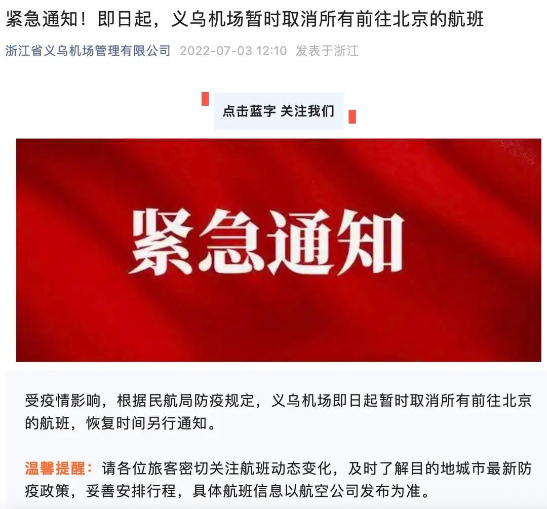 7月3日,浙江省义乌机场管理有限公司微信公众号发布紧急通知称,受疫情影响,根据民航局防疫规定,义乌机场即日起暂时取消所有前往北京的航班,恢复时间另行通知。