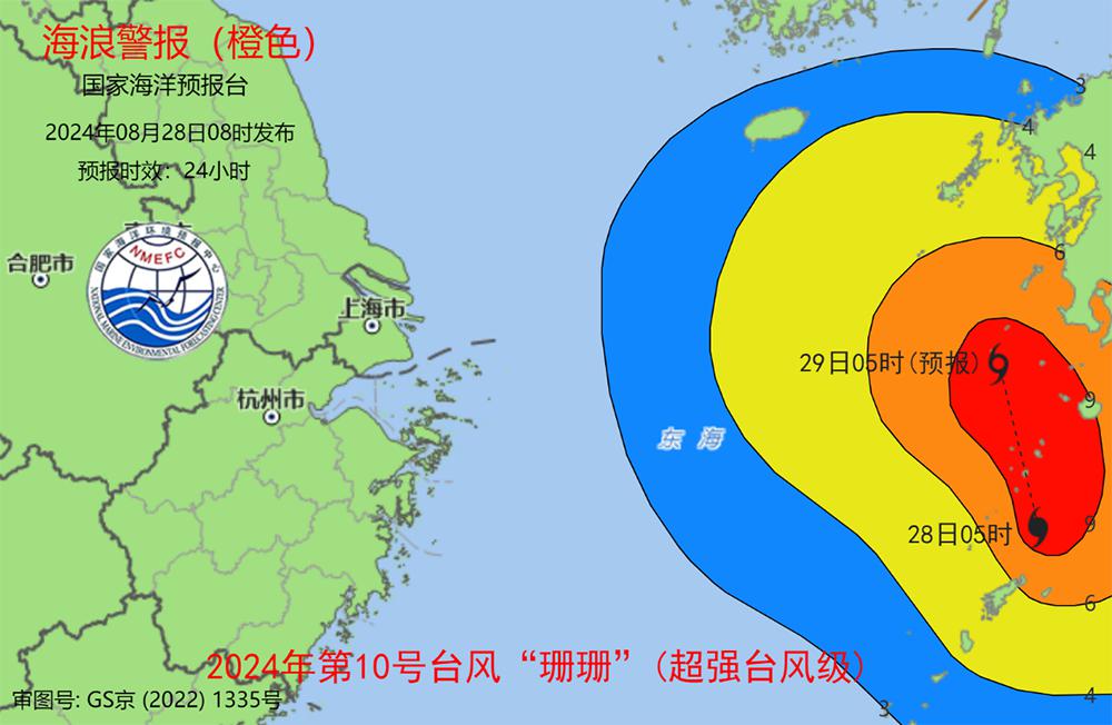 受今年第 10 号台风 " 珊珊 "(超强台风级)的影响,预计 8 月 28 日中午到 29 日中午,东海东部将出现 6 米到 9 米的狂浪到狂涛区,近海海域海浪预警级别为橙色。请在上述海域作业的船只注意安全,沿海各有关单位提前采取防浪避浪措施。