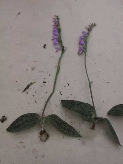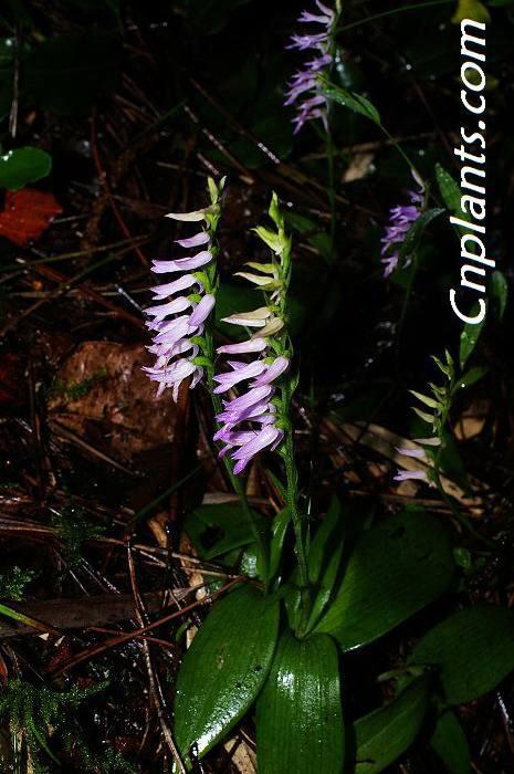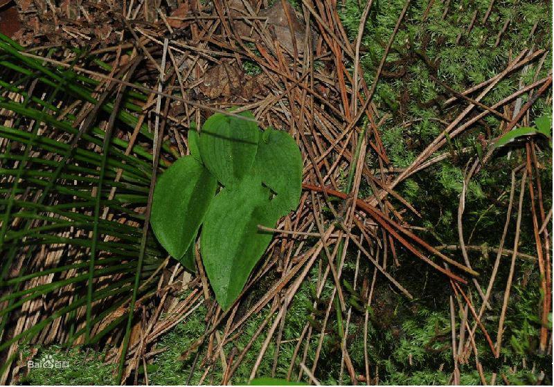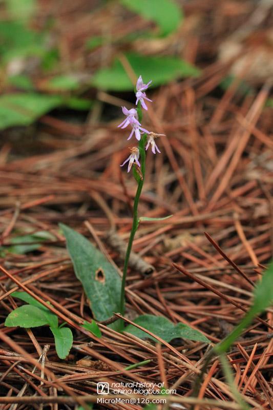 原形态多年生草本。块茎球形;茎直立,单一,高10~15厘米。基生叶2枚,对生;宽披针形或卵状披针形,长3~6厘米,宽1~3厘米;茎生叶细小,呈苞片状。穗状花序通常为一侧生;花淡红紫色;除唇瓣以外的花被片皆互相靠合成为盔瓣状,唇瓣3深裂,裂片线形,距较细,与子房近等长。蒴果。
