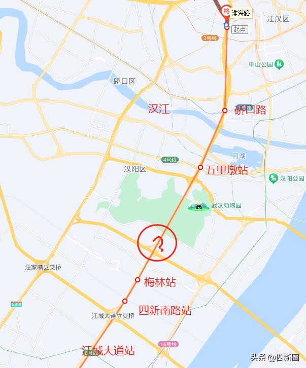 一期在建由北洋桥至淮海路,二期武汉商务区到沌口,根据目前地铁集团回复的消息,预计10号线在汉阳区的4个站点如下:武汉动物园附近区域有规划10号线敷设,从淮海路过汉江过来,最近的应该是五里墩站,与11号线四期梅林站有换乘,再就是12号线四新南路站,再后面就是武汉经开区了,还有一个站点应该就设在过墨水湖大桥后与梅林站之间的这部分了,就看是离墨水湖南路更近还是离四新北路更近。
