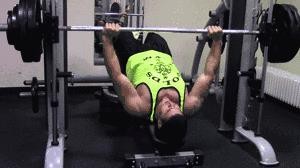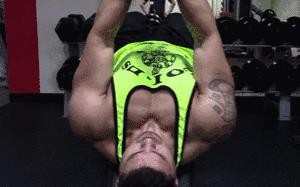 动作3:下斜杠铃片上推,建议做3-4组,每组做12-15次。