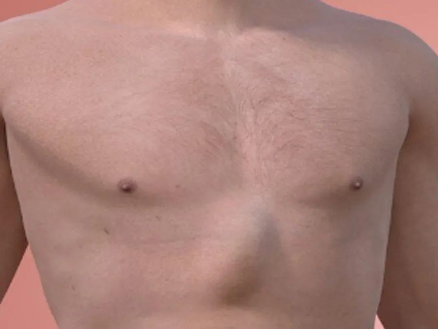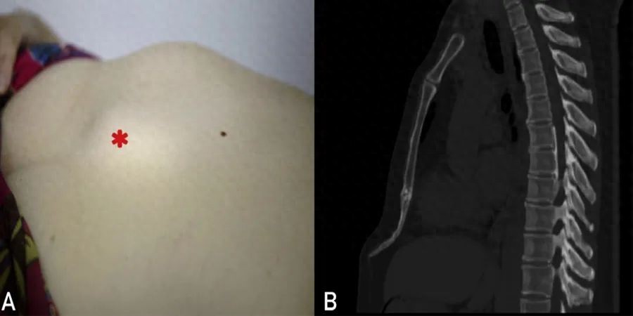测量的剑突长度、宽度和厚度分别为63.2mm(参考范围,40-50mm)、21.1mm(参考范围,15-20mm)和4.9mm(参考范围,3-5mm)。胸骨体至剑突的角度为138°(参考范围160°-180°)。
