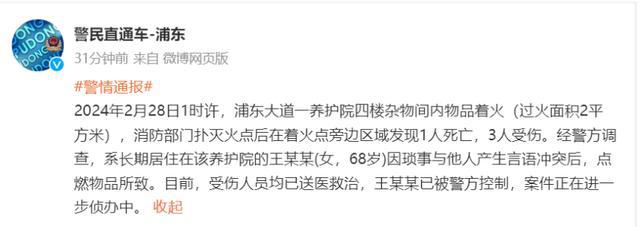 大皖新闻讯 据 @警民直通车 - 浦东消息,2024 年 2 月 28 日 1 时许,浦东大道一养护院四楼杂物间内物品着火(过火面积 2 平方米),消防部门扑灭火点后在着火点旁边区域发现 1 人死亡,3 人受伤。经警方调查,系长期居住在该养护院的王某某 ( 女,68 岁 ) 因琐事与他人产生言语冲突后,点燃物品所致。目前,受伤人员均已送医救治,王某某已被警方控制,案件正在进一步侦办中。