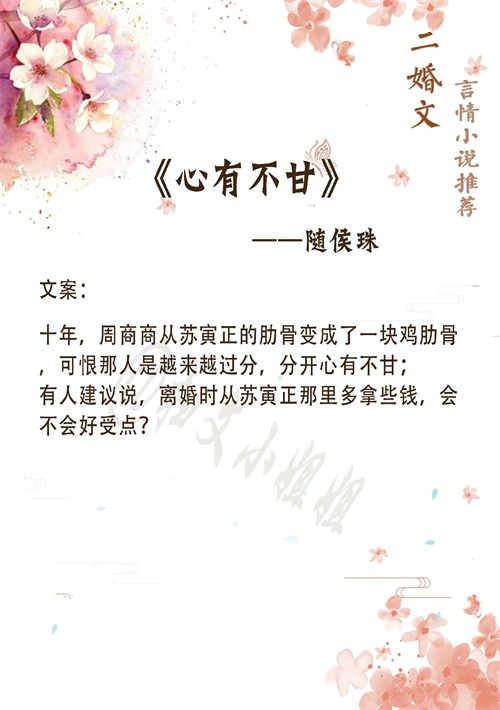 随侯珠的《心有不甘》也好虐,女主学生时代就和男主苏寅正在一起,学生时代的恋爱真挚纯情,也同甘共苦经历了很多,后来男主立业了也和女主结婚了,结果他出轨了!女主还怀了孕就打掉了,前期真的有点虐女主,男二韩峥是他们俩多年的好友,也见证了他们从结婚后的甜蜜一步步到婚变,也为女主不平,他看到女主为苏的付出感到心疼,其实感觉他学生时代应该也喜欢女主,但是是兄弟的女朋友就放弃了,女主离婚后就一直默默守在女主身边,最后两人结婚还生了孩子。