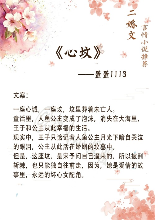 蛋蛋1113的《心坟》男主前期纯渣,可以说渣的光明正大。和女主结婚五年并且在有一个五岁女儿的情况下,还在外面情史不断彩旗飘飘。渣男主婚内出轨让白月光怀了自己的孩子,于是女主提出离婚,男主在追着白月光去日本的时候发生海啸,女儿就死在了那场海啸里。这件事也成了压垮女主最后的稻草,女主疯了!一直陪着女主的男二开始照顾女主的生活,但是男主还是不肯放过女主,苦苦纠缠。
