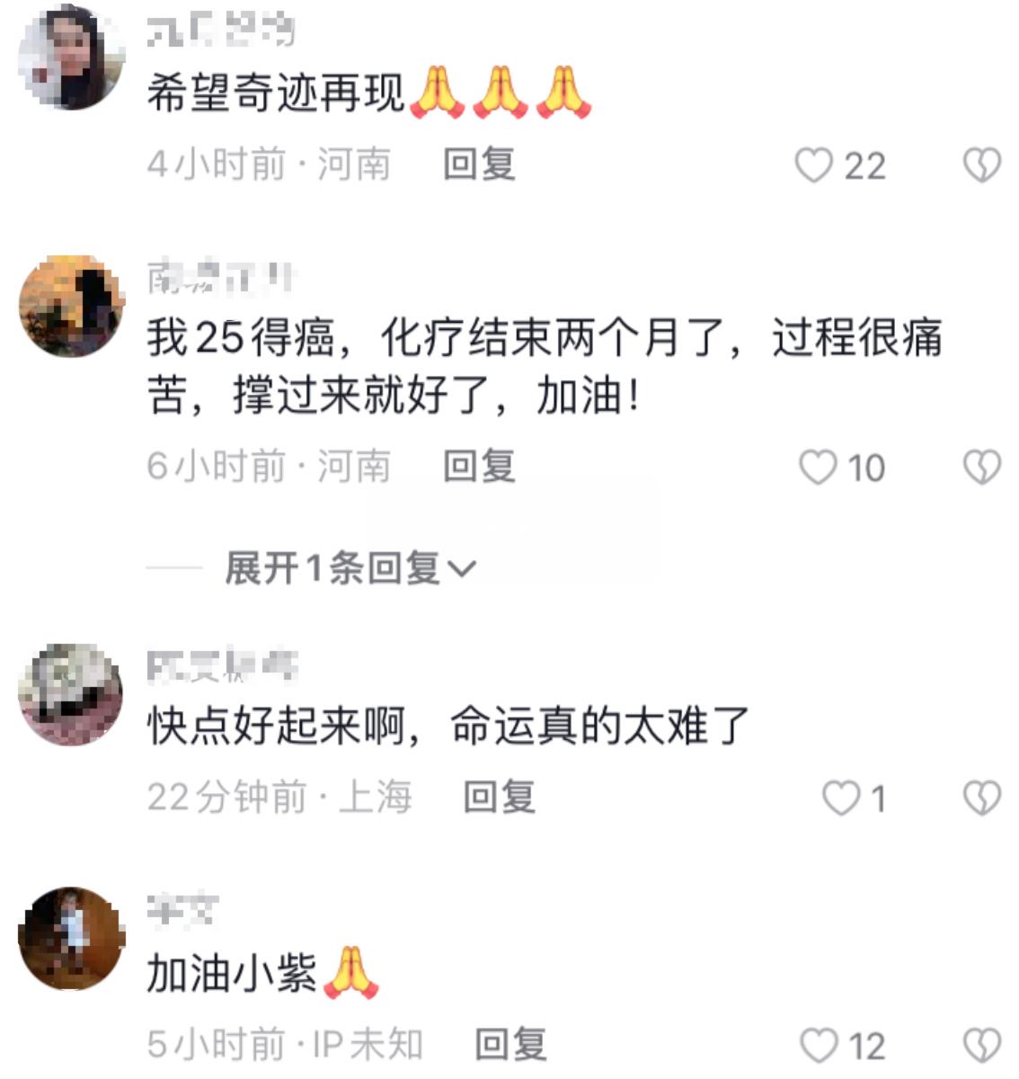 看完抗癌女孩小紫的最新动态,不少网友泪目了,心疼不已,不少网友暖心安慰,为其祈祷,希望能够有奇迹的出现,也能够看出,小紫对于生命的渴望和热爱。