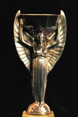 世界杯赛的奖杯是1928年,国际足联为得胜者特制的奖品,是由巴黎著名首饰技师弗列尔铸造的。其模特是希腊传说中的胜利女神尼凯,她身着古罗马束腰长袍,双臂伸直,手中捧一只大杯。雕像由纯金铸成,重1800克,高30厘米,立在大理石底座上。此杯为流动奖品,谁得了冠军,可把金杯保存4年,到下一界杯赛前交还给国际足联,以便发给新的世界冠军。此外有一个附加规定是:谁连续三次获得世界冠军,谁将永远得到此杯。