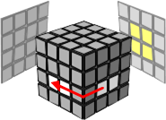 我们准备旋转上面的轨道。右侧的绿橙对儿就会如白色箭头所示转到前面所示的位置,所以在前面的靠下两个位置,我们要准备好绿橙对儿的位置,也就是绿色在左,橙色在右,所以我们要如图这样旋转一下前面。