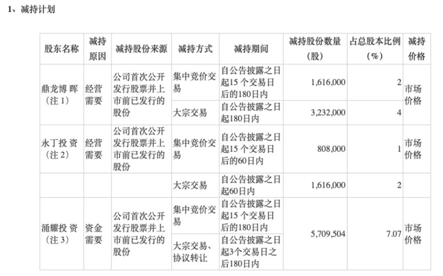持股 6.03% 的股东宁波永丁股权投资合伙企业(有限合伙),拟合计减持公司不超过 3% 的股份;持股 7.07% 的股东宁波梅山保税港区涌耀股权投资合伙企业(有限合伙)则拟清仓减持公司不超过 7.07% 的股份。