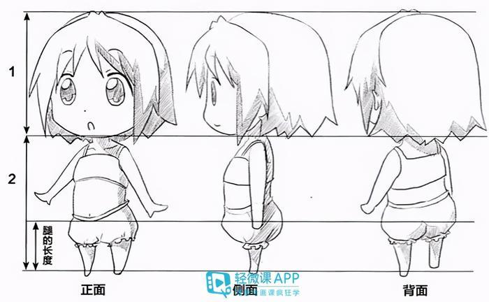 2头身Q版漫画人物的头部和身体的长度大致相同,绘制时注意将整个身体缩小,头宽要大于肩宽才能协调。塑造可爱的2头身Q版人物时,除了头大身小的特征外,还要注意腿的长度很短,大约是身体的1/3,胳膊甚至比腿要长。