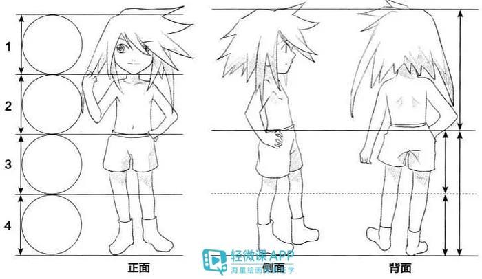 基本相当于正常头身比例的小孩子体型,但是从表情、动态、服饰上还是能够看出属于Q版角色。4头身人物的体型可以画得较为写实,膝盖在腰部至脚底1/2的位置,小腿比大腿长一些能体现出人物的修长感。