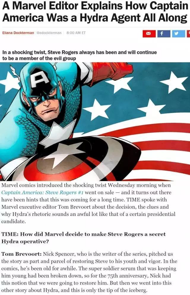 漫威高级副总裁Tom Brevoort也证实美国队长的真实身份是为九头蛇效力的卧底特工!!