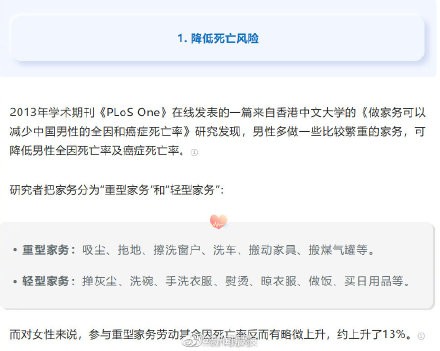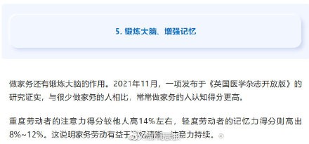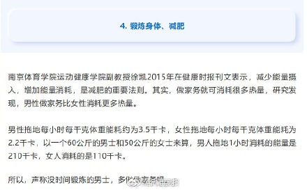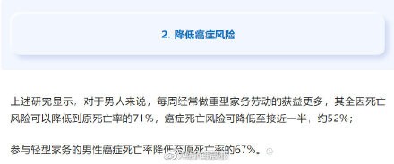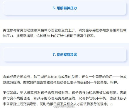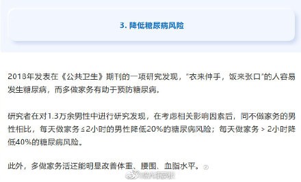 在家务上,女性不要“大权独揽”,要“放权”让丈夫、孩子也动起来,有事大家做。这不但可以减轻女性自己的负担,对男性也是好处多多:①降低死亡风险;②降低癌症风险;③降低糖尿病风险;④锻炼身体、减肥;⑤锻炼大脑、增强记忆;⑥缓解精神压力;⑦促进家庭和谐。做家务,不仅因为这是自己的家,更是爱家、爱家人的表现。(健康时报)