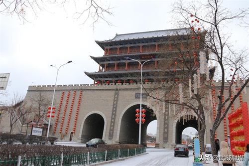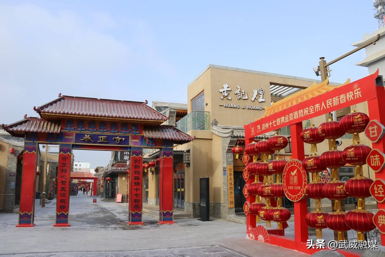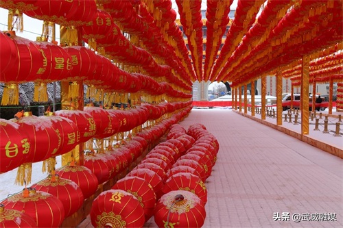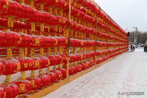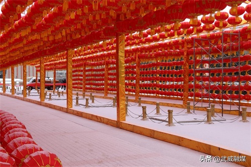 1月14日,武威市出现降雪天气,喜庆的红灯笼和皑皑白雪相互映衬,为武威绘就了一幅美丽红火的迎春图景。