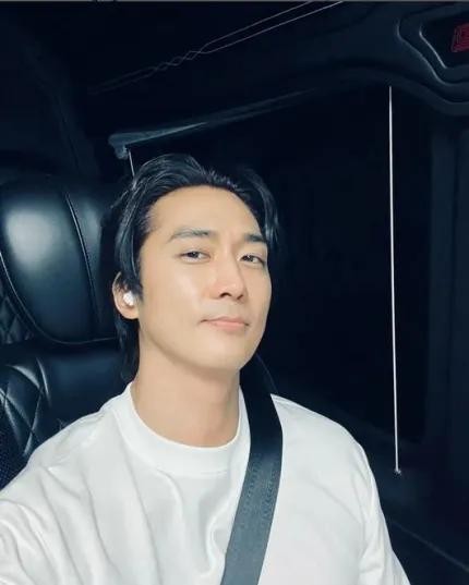 公开的照片中是宋承宪乘车移动中的样子。白色t恤上系安全带的宋承宪带着无线耳机。