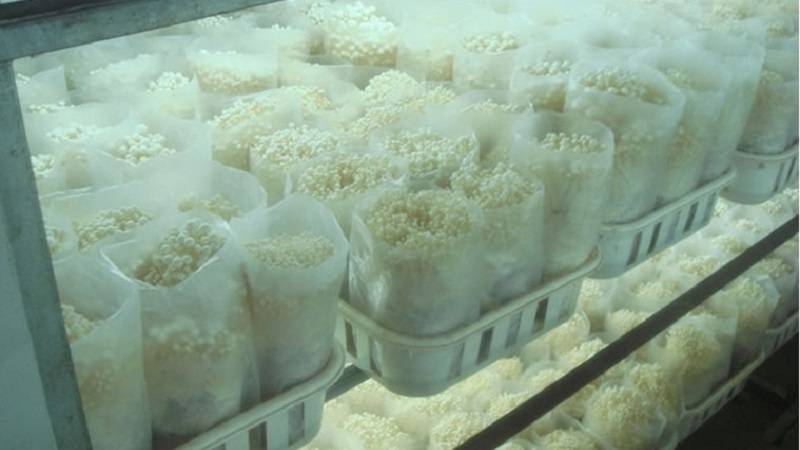 白色种菌盖白色,菌柄细且柔韧,菌盖小到中等,菌柄白色,基部常有绒毛,菌柄较长,子实体个数较多,不易开伞。这类品种几乎都引自日本,多数白色种产量相对较低,较黄色种和浅色低20%左右。白色种由黄色或浅色种突变而来,在长期的营养生长中发生突变的频率也较高,变异也很快,因此,退化的发生较前两类品种快,这也正是许多菇农使用来源不清的白色种产量低的重要原因。