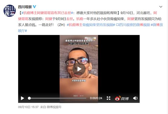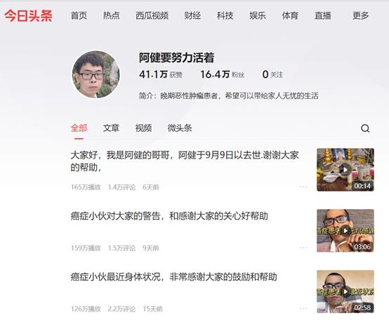 好了回到之前的话题咱们接着聊[快哭了],阿健在发布第一则视频的时候并没有引起网上的注意,之后阿健每天在头条发布一条自己的视频,与网友一起分享自己的抗癌过程与生活感悟。后因为病情加重才每隔一段时间发一次,这样的更新一直持续到他去世,接着由其哥哥继续更新了最新的一期视频。这时已经是阿健的葬礼了。