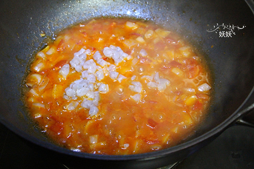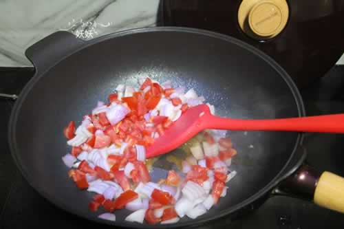 8,加入切成丁的洋葱,西红柿炒出香味。