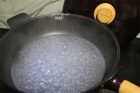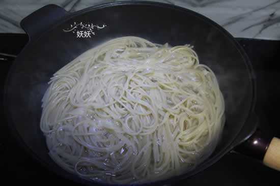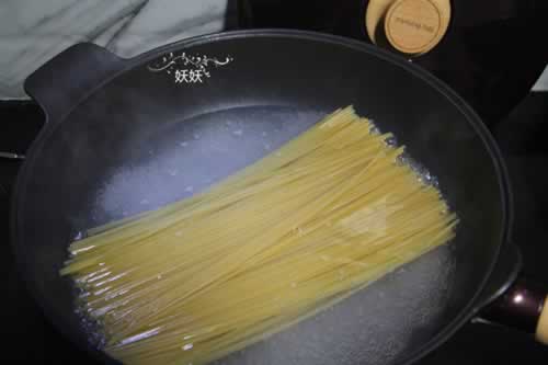 3,水开后加入意大利面,这时最好加入一小勺盐,煮出来的面入味又爽口。