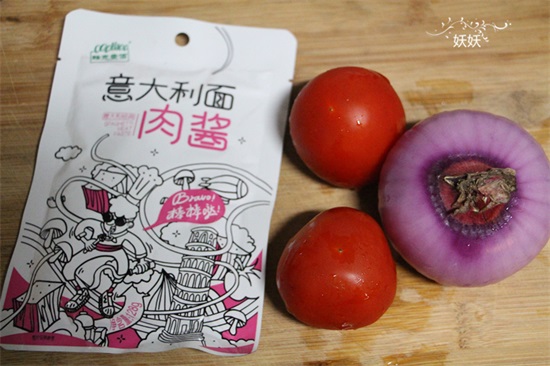 4,配料准备了现成的肉酱,一个洋葱和两个西红柿,喜欢吃西红柿的可以多加一两个,洋葱也都可以根据口味增减。