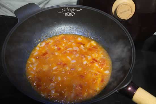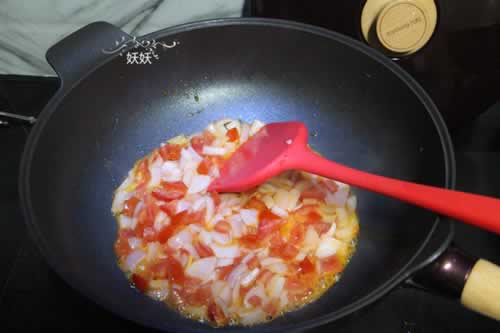 9,西红柿炒制过程中会出汁,洋葱也会变软。