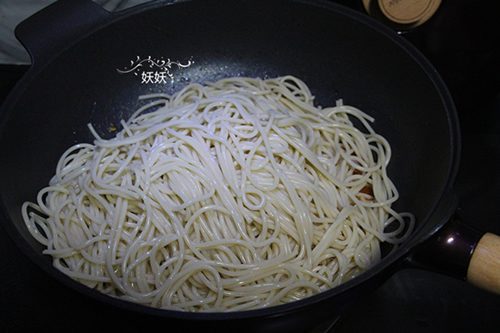 15,翻拌均匀,大概再炒上一两分钟,让意面充分吸收酱汁。