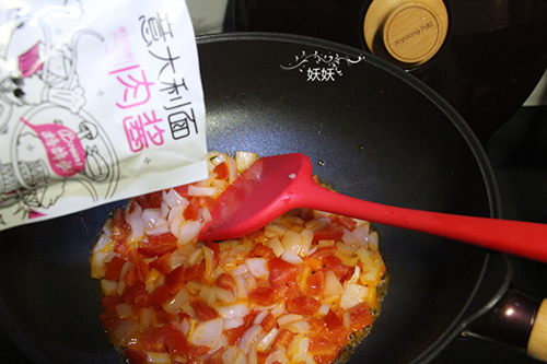 10,这时倒入意大利面肉酱,翻炒均匀,肉酱里各种配料都有了,味道也很正,所以无需再另外添加别的配料。