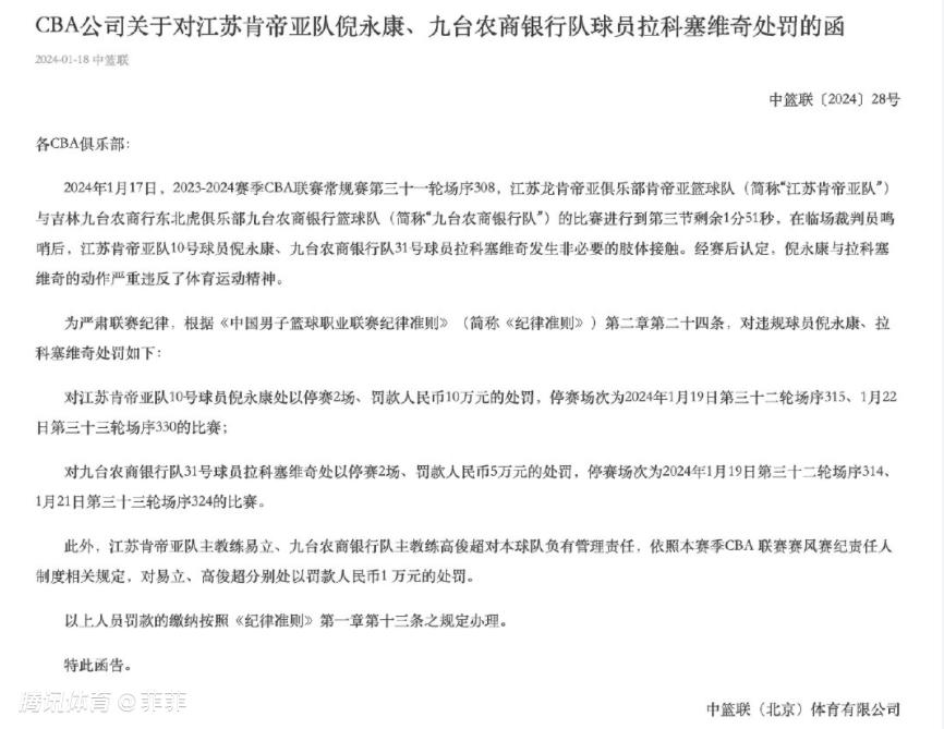 CBA 官方公告写道:在 2024 年 1 月 17 日,2025-2024 赛季 CBA 联赛第 31 轮比赛,江苏男篮对阵吉林男篮,在比赛进行到第三节 1 分 51 秒之时,江苏男篮球员倪永康与吉林男篮外援球员拉科塞维奇发生非必要的肢体接触,裁判经过回放,倪永康与拉科塞维奇的动作严重违反了体育运动精神,倪永康停赛 2 场比赛,罚款 10 万元,拉科塞维奇停赛 2 场比赛,罚款 5 万元,易立与高俊超因为管理不当,各处罚 1 万元。