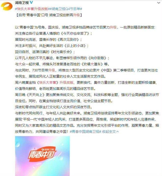 湖南卫视发布Q4综艺节目单,致力于打造更贴近生活、人文的好综艺
