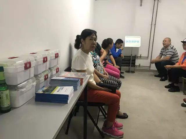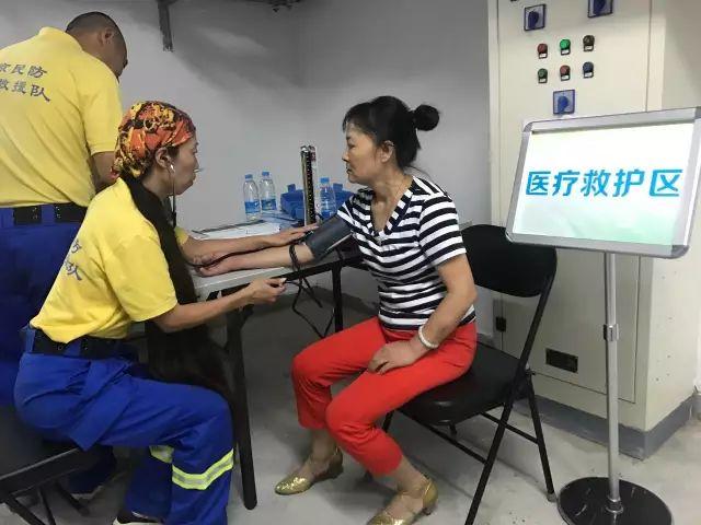 物资储备区也已经准备好了棉被、饮用水、方便面等物资。参与演练的一位居民突然感觉不太舒服,北京民防浩天救援队的队员立刻用人防工程内准备好的血压计帮其测量血压,发现血压偏高。