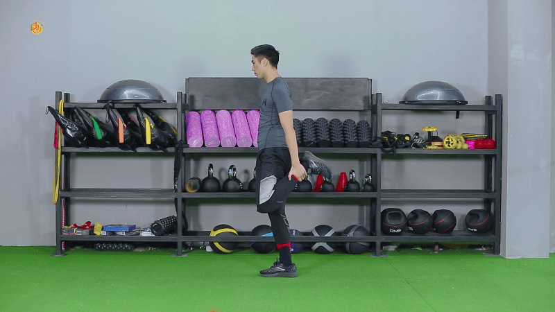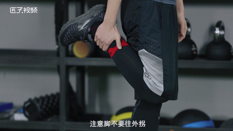 3、右腿前侧拉伸,双腿自然分开,腹部收紧,挺胸下颚微收,右手拉住小腿。